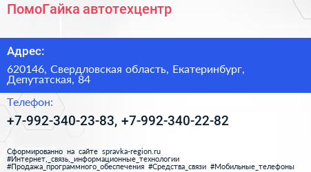 ПомоГайка, автотехцентр по адресу 620146, Свердловская область, Екатеринбург, Депутатская, 84 в дальнейшем Организация, размещена в следующих категориях: