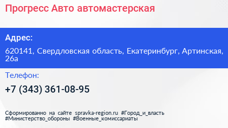 Прогресс-Авто, автомастерская по адресу 620141, Свердловская область, Екатеринбург, Артинская, 26а в дальнейшем Организация, размещена в следующих категориях: