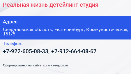 Реальная жизнь, детейлинг-студия по адресу Свердловская область, Екатеринбург, Коммунистическая, 151/5 в дальнейшем Организация, размещена в следующих категориях: