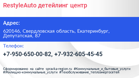 RestyleAuto, детейлинг-центр по адресу 620146, Свердловская область, Екатеринбург, Депутатская, 87 в дальнейшем Организация, размещена в следующих категориях: