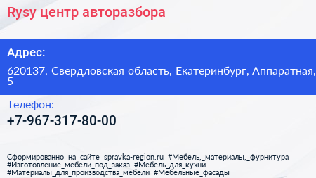 Rysy, центр авторазбора по адресу 620137, Свердловская область, Екатеринбург, Аппаратная, 5 в дальнейшем Организация, размещена в следующих категориях: