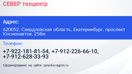 СЕВЕР, техцентр по адресу 620052, Свердловская область, Екатеринбург, проспект Космонавтов, 258ж в дальнейшем Организация, размещена в следующих категориях: