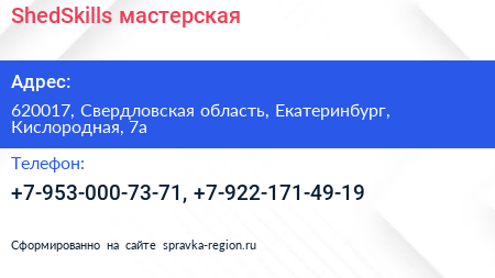 ShedSkills, мастерская по адресу 620017, Свердловская область, Екатеринбург, Кислородная, 7а в дальнейшем Организация, размещена в следующих категориях: