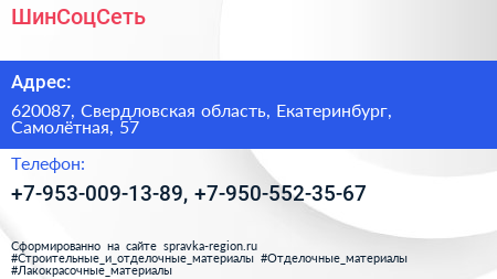ШинСоцСеть по адресу 620087, Свердловская область, Екатеринбург, Самолётная, 57 в дальнейшем Организация, размещена в следующих категориях:
