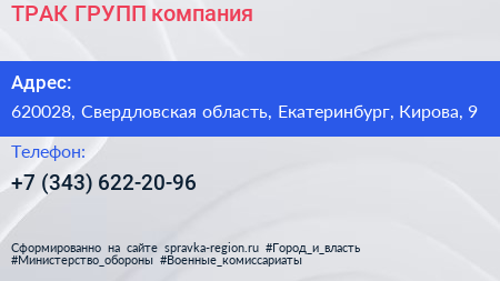 ТРАК ГРУПП, компания по адресу 620028, Свердловская область, Екатеринбург, Кирова, 9 в дальнейшем Организация, размещена в следующих категориях: