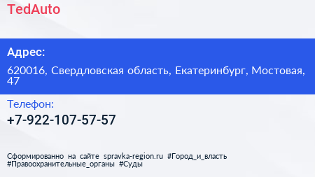 TedAuto по адресу 620016, Свердловская область, Екатеринбург, Мостовая, 47 в дальнейшем Организация, размещена в следующих категориях: