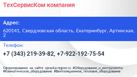 ТехСервисКом, компания по адресу 620141, Свердловская область, Екатеринбург, Артинская, 2 в дальнейшем Организация, размещена в следующих категориях: