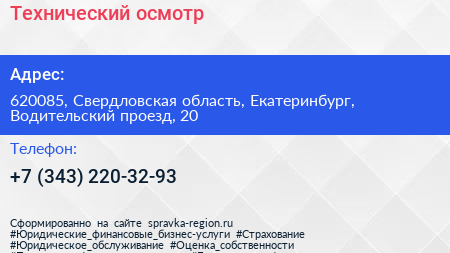 Технический осмотр по адресу 620085, Свердловская область, Екатеринбург, Водительский проезд, 20 в дальнейшем Организация, размещена в следующих категориях: