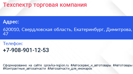 Техспектр, торговая компания по адресу 620010, Свердловская область, Екатеринбург, Димитрова, 47 в дальнейшем Организация, размещена в следующих категориях: