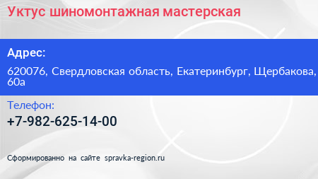 Уктус, шиномонтажная мастерская по адресу 620076, Свердловская область, Екатеринбург, Щербакова, 60а в дальнейшем Организация, размещена в следующих категориях: