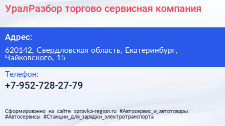 УралРазбор, торгово-сервисная компания по адресу 620142, Свердловская область, Екатеринбург, Чайковского, 15 в дальнейшем Организация, размещена в следующих категориях: