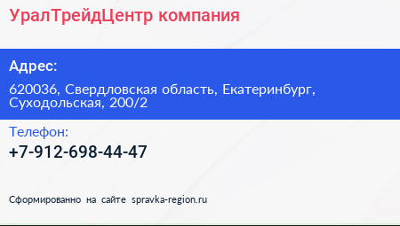 УралТрейдЦентр, компания по адресу 620036, Свердловская область, Екатеринбург, Суходольская, 200/2 в дальнейшем Организация, размещена в следующих категориях: