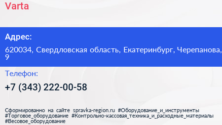 Varta по адресу 620034, Свердловская область, Екатеринбург, Черепанова, 9 в дальнейшем Организация, размещена в следующих категориях: