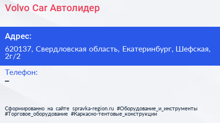 Volvo Car Автолидер по адресу 620137, Свердловская область, Екатеринбург, Шефская, 2г/2 в дальнейшем Организация, размещена в следующих категориях: