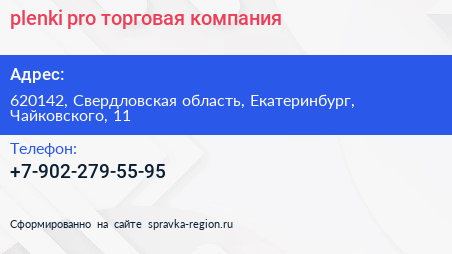 plenki.pro, торговая компания по адресу 620142, Свердловская область, Екатеринбург, Чайковского, 11 в дальнейшем Организация, размещена в следующих категориях: