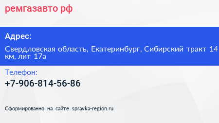 ремгазавто.рф по адресу Свердловская область, Екатеринбург, Сибирский тракт 14 км, лит 17а в дальнейшем Организация, размещена в следующих категориях: