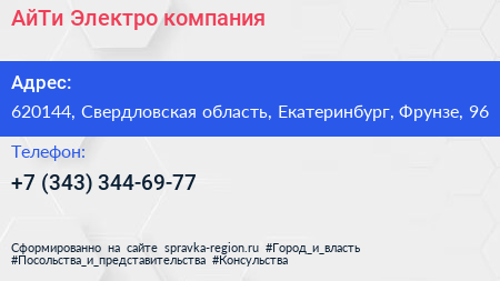 АйТи-Электро, компания по адресу 620144, Свердловская область, Екатеринбург, Фрунзе, 96 в дальнейшем Организация, размещена в следующих категориях: