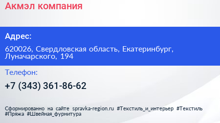 Акмэл, компания по адресу 620026, Свердловская область, Екатеринбург, Луначарского, 194 в дальнейшем Организация, размещена в следующих категориях: