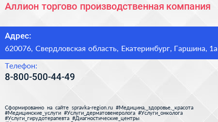 Аллион, торгово-производственная компания по адресу 620076, Свердловская область, Екатеринбург, Гаршина, 1а в дальнейшем Организация, размещена в следующих категориях: