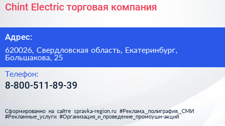 Chint Electric, торговая компания по адресу 620026, Свердловская область, Екатеринбург, Большакова, 25 в дальнейшем Организация, размещена в следующих категориях: