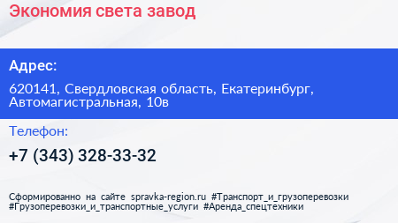 Экономия света, завод по адресу 620141, Свердловская область, Екатеринбург, Автомагистральная, 10в в дальнейшем Организация, размещена в следующих категориях: