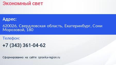 Экономный свет по адресу 620026, Свердловская область, Екатеринбург, Сони Морозовой, 180 в дальнейшем Организация, размещена в следующих категориях: