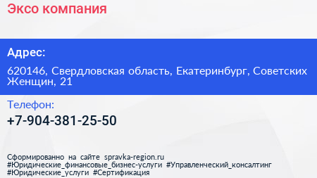 Эксо, компания по адресу 620146, Свердловская область, Екатеринбург, Советских Женщин, 21 в дальнейшем Организация, размещена в следующих категориях: