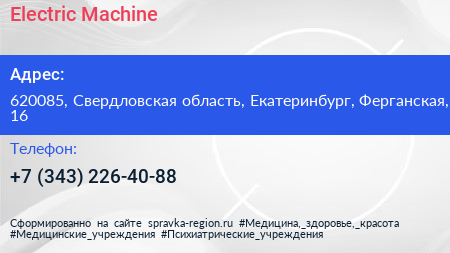 Electric Machine по адресу 620085, Свердловская область, Екатеринбург, Ферганская, 16 в дальнейшем Организация, размещена в следующих категориях: