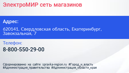 ЭлектроМИР, сеть магазинов по адресу 620141, Свердловская область, Екатеринбург, Завокзальная, 7 в дальнейшем Организация, размещена в следующих категориях: