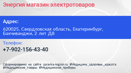 Энергия, магазин электротоваров по адресу 620025, Свердловская область, Екатеринбург, Бахчиванджи, 2 лит Д8 в дальнейшем Организация, размещена в следующих категориях:
