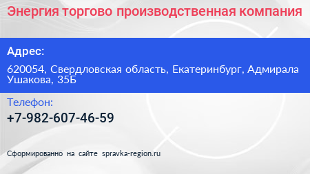 Энергия, торгово-производственная компания по адресу 620054, Свердловская область, Екатеринбург, Адмирала Ушакова, 35Б в дальнейшем Организация, размещена в следующих категориях: