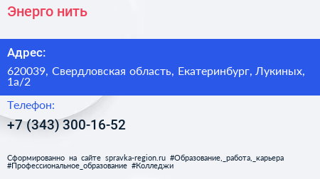 Энерго-нить по адресу 620039, Свердловская область, Екатеринбург, Лукиных, 1а/2 в дальнейшем Организация, размещена в следующих категориях: