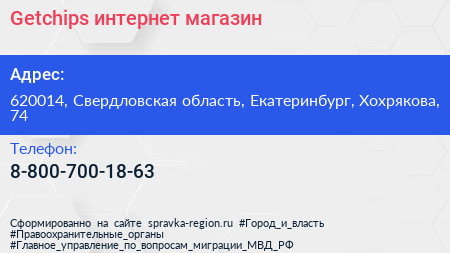 Getchips, интернет-магазин по адресу 620014, Свердловская область, Екатеринбург, Хохрякова, 74 в дальнейшем Организация, размещена в следующих категориях: