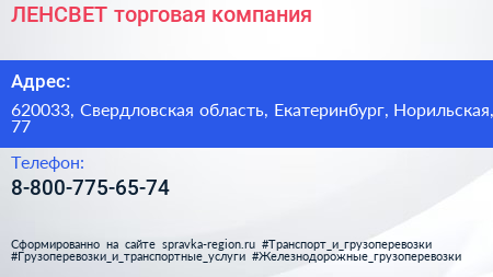 ЛЕНСВЕТ, торговая компания по адресу 620033, Свердловская область, Екатеринбург, Норильская, 77 в дальнейшем Организация, размещена в следующих категориях: