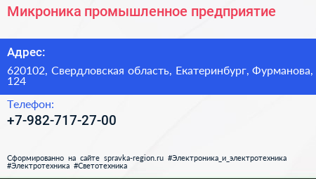 Микроника, промышленное предприятие по адресу 620102, Свердловская область, Екатеринбург, Фурманова, 124 в дальнейшем Организация, размещена в следующих категориях: