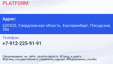 PLATFORM по адресу 620102, Свердловская область, Екатеринбург, Посадская, 28а в дальнейшем Организация, размещена в следующих категориях: