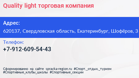 Quality light, торговая компания по адресу 620137, Свердловская область, Екатеринбург, Шофёров, 3 в дальнейшем Организация, размещена в следующих категориях: