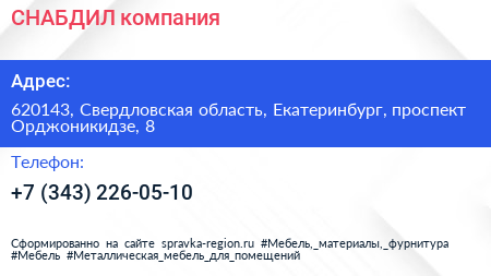 СНАБДИЛ, компания по адресу 620143, Свердловская область, Екатеринбург, проспект Орджоникидзе, 8 в дальнейшем Организация, размещена в следующих категориях: