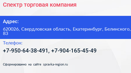 Спектр, торговая компания по адресу 620026, Свердловская область, Екатеринбург, Белинского, 83 в дальнейшем Организация, размещена в следующих категориях: