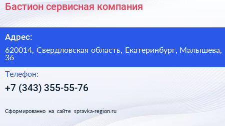 Бастион, сервисная компания по адресу 620014, Свердловская область, Екатеринбург, Малышева, 36 в дальнейшем Организация, размещена в следующих категориях: