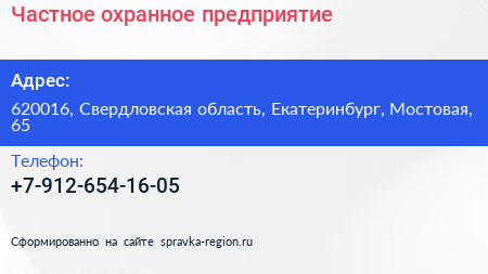 Частное охранное предприятие по адресу 620016, Свердловская область, Екатеринбург, Мостовая, 65 в дальнейшем Организация, размещена в следующих категориях: