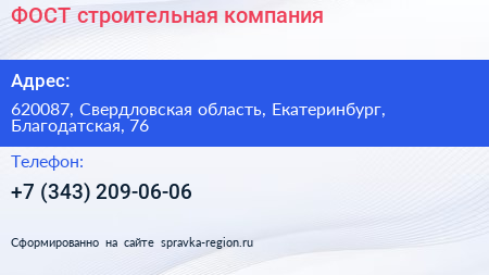 ФОСТ, строительная компания по адресу 620087, Свердловская область, Екатеринбург, Благодатская, 76 в дальнейшем Организация, размещена в следующих категориях: