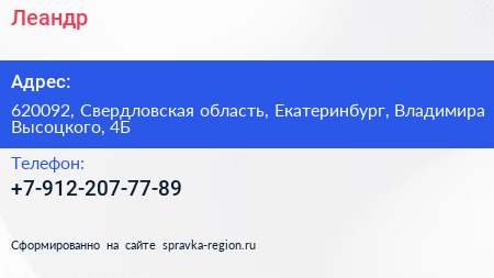 Леандр по адресу 620092, Свердловская область, Екатеринбург, Владимира Высоцкого, 4Б в дальнейшем Организация, размещена в следующих категориях: