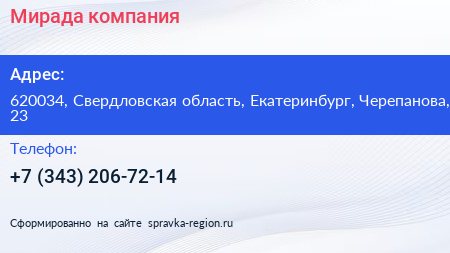 Мирада, компания по адресу 620034, Свердловская область, Екатеринбург, Черепанова, 23 в дальнейшем Организация, размещена в следующих категориях: