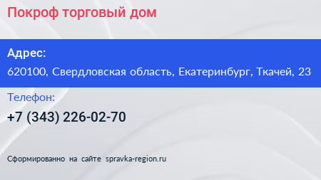 Покроф, торговый дом по адресу 620100, Свердловская область, Екатеринбург, Ткачей, 23 в дальнейшем Организация, размещена в следующих категориях: