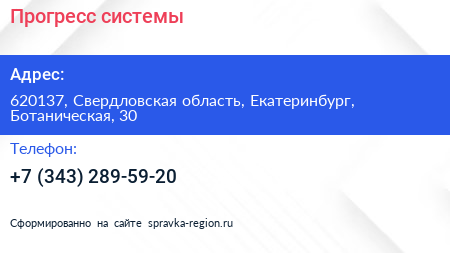 Прогресс-системы по адресу 620137, Свердловская область, Екатеринбург, Ботаническая, 30 в дальнейшем Организация, размещена в следующих категориях: