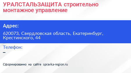УРАЛСТАЛЬЗАЩИТА, строительно-монтажное управление по адресу 620073, Свердловская область, Екатеринбург, Крестинского, 44 в дальнейшем Организация, размещена в следующих категориях: