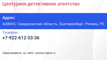 Центурион, детективное агентство по адресу 620043, Свердловская область, Екатеринбург, Репина, 95 в дальнейшем Организация, размещена в следующих категориях:
