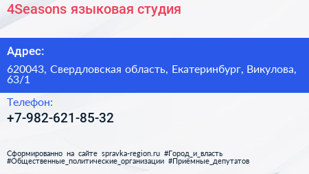 4Seasons, языковая студия по адресу 620043, Свердловская область, Екатеринбург, Викулова, 63/1 в дальнейшем Организация, размещена в следующих категориях: