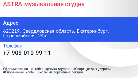 ASTRA, музыкальная студия по адресу 620219, Свердловская область, Екатеринбург, Первомайская, 24а в дальнейшем Организация, размещена в следующих категориях: